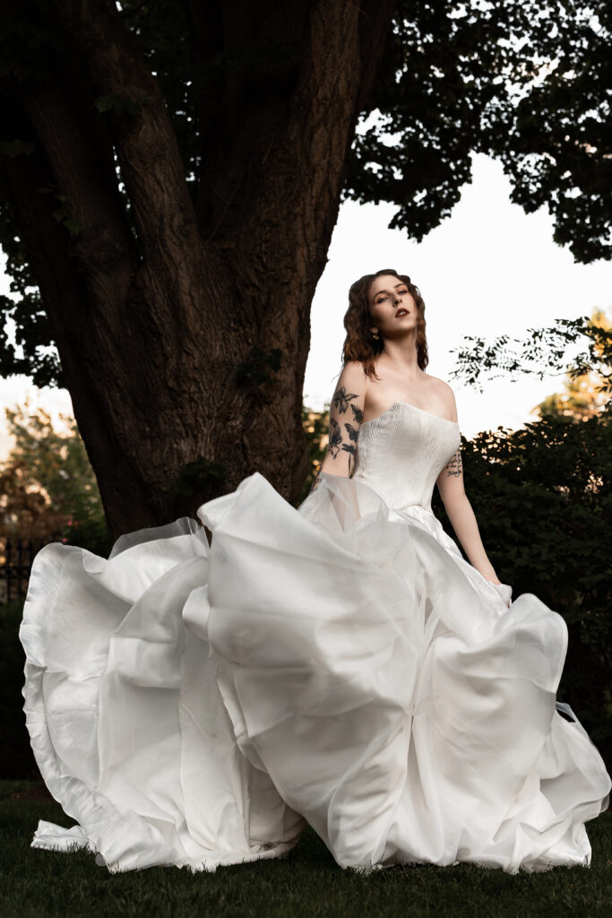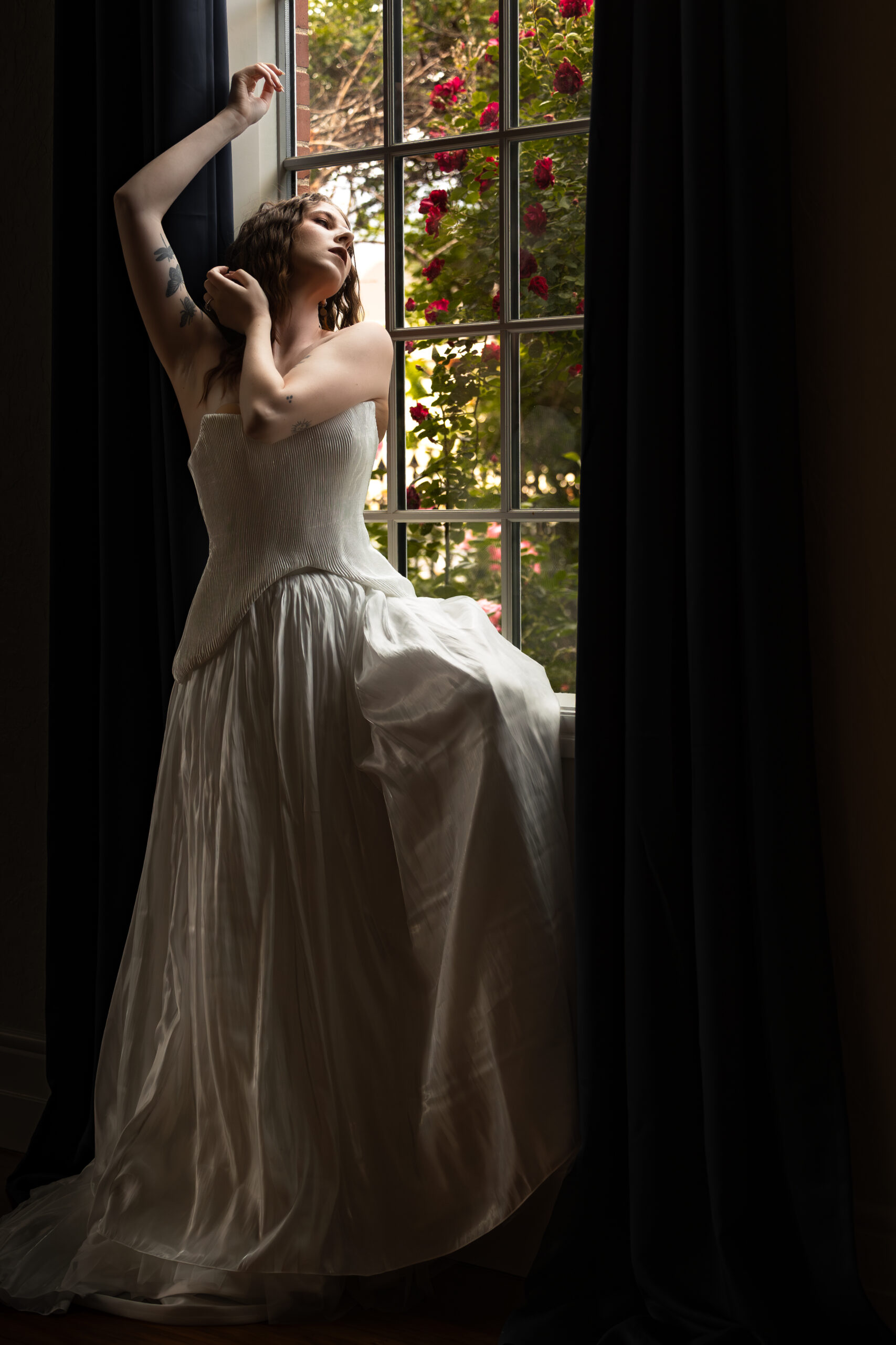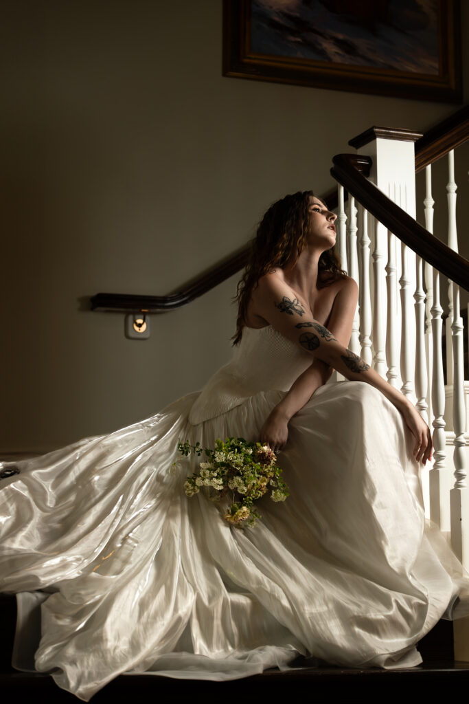 This shoot was all about contrast—playing with the venue’s rich, traditional setting while styling the shoot with fresh textures and editorial details. The pleated ivory gown from Renee Atelier , by designer Hera Couture , brought drama and movement, with sculptural lines that gave a nod to historical fashion while feeling wildly current. Paired with undone curls and a striking, sculpted bouquet by Audrey Rose Floral, we leaned into a bridal aesthetic that feels just a bit rebellious, in all the best ways.