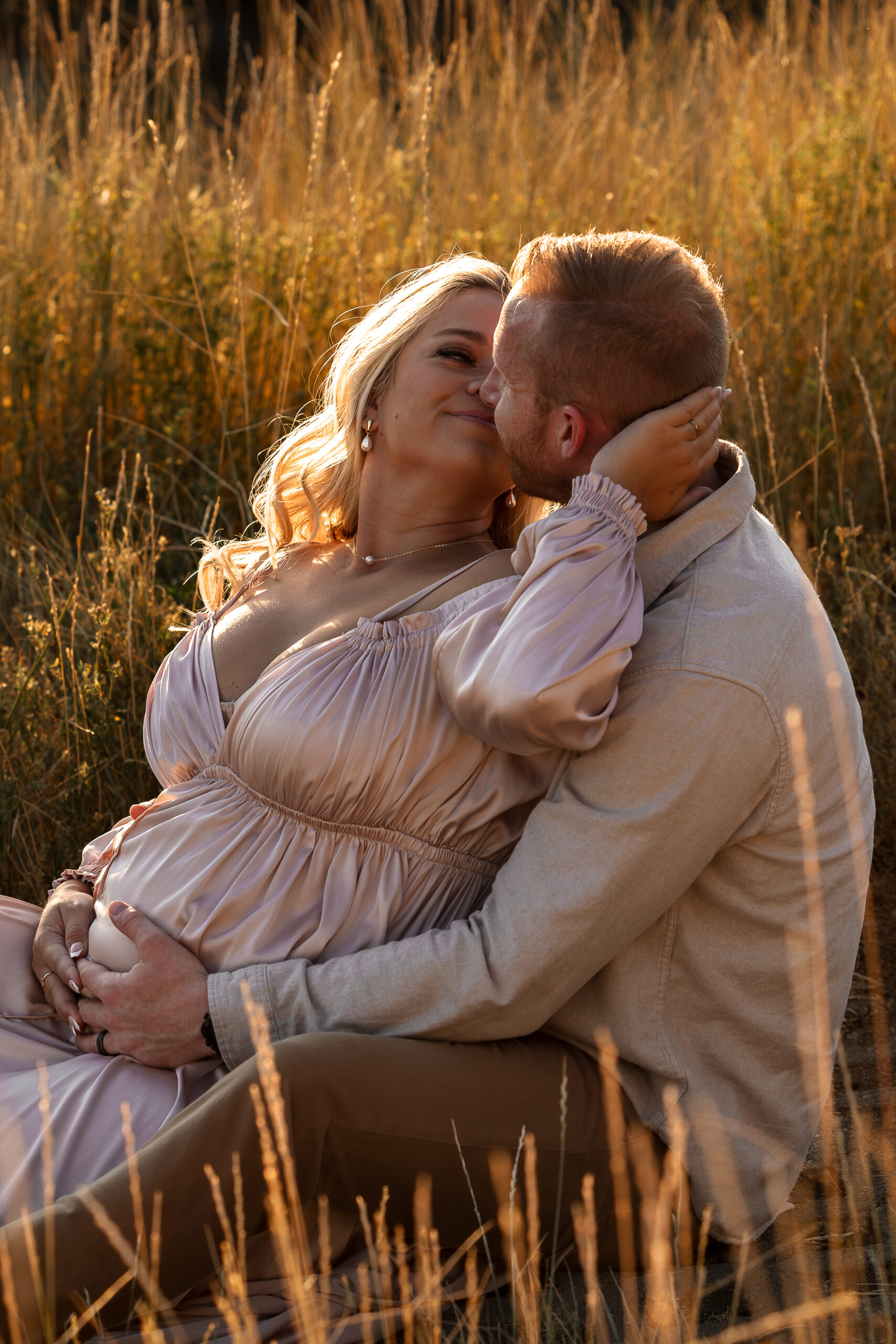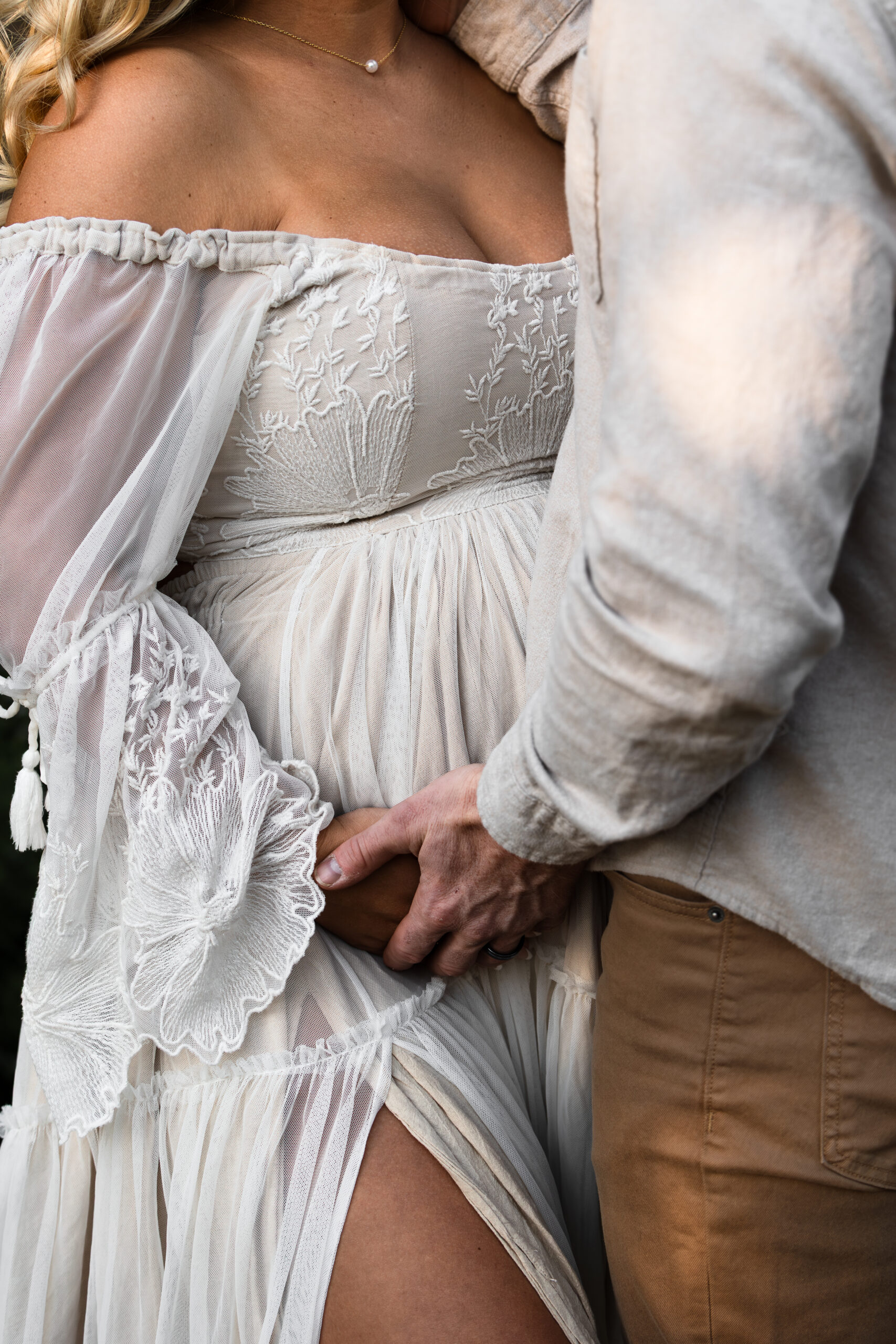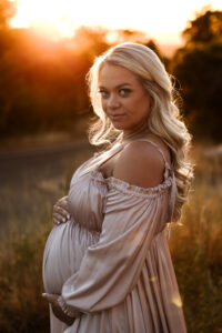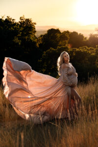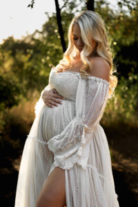Brooke wore two stunning gowns that brought the session to life. A flowing off-the-shoulder white dress from felt timeless and ethereal against the greenery, while a dramatic blush gown caught the golden light with every movement. The combination created an editorial yet deeply personal feel, perfectly reflecting the beauty of maternity: soft, strong, and full of anticipation.